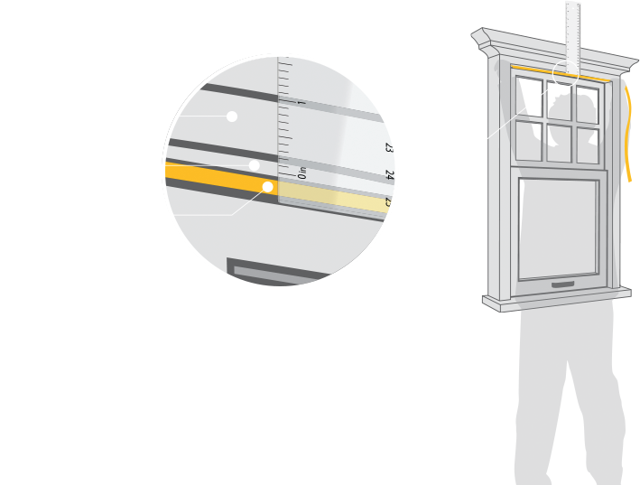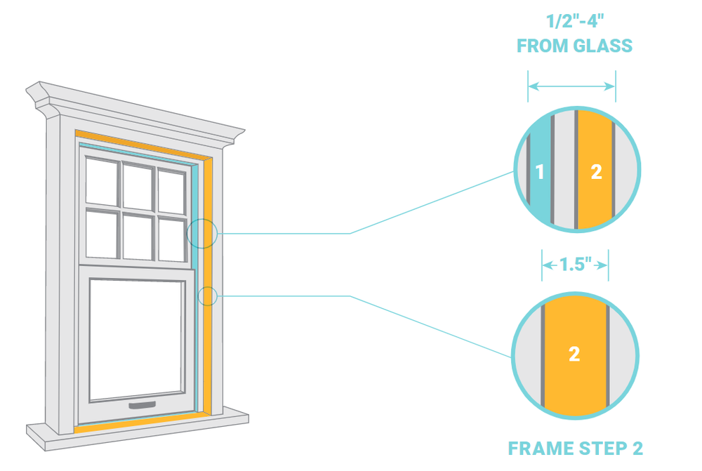 Some windows have more than one frame step, while other windows have just a single, flat surface. This example shows two frame steps, (1) in blue and (2) in yellow. For each window, you will be taking a set of 6 measurements which must be taken on the same frame step.