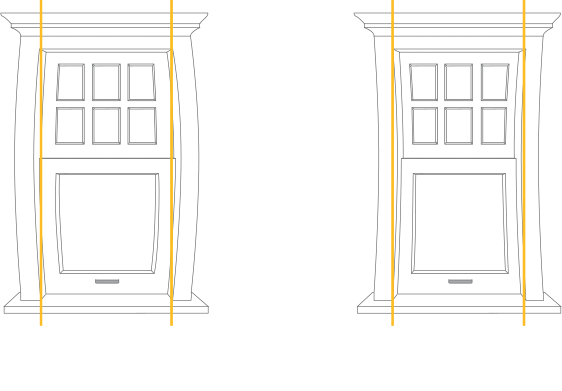 Convex: Stretch a string, level, or other straight edge tool from corner to corner on one side. Pull it tight to see if there’s a point where the string (or other tool) isn’t touching the frame (see convex diagram). If you see a gap, the frame has an outward convex bow. Check all four sides of each window.